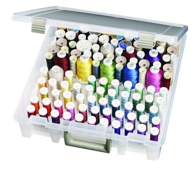 Diese Kunststoffbox ist ein wahrer Ordnungskünstler. Bis zu 224 Garnspulen (20mm) können hier gleichzeitig aufbewahrt werden.