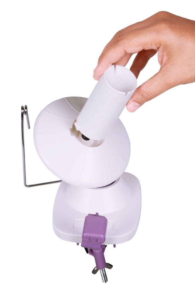 Wickelt aus Strangware ein gleichmäßiges Wollknäuel. Das fertige Knäuel kann einfach vom Konus abgezogen werden. Danach können Sie das Knäuel wie gewohnt von innen oder aussen abwickeln.