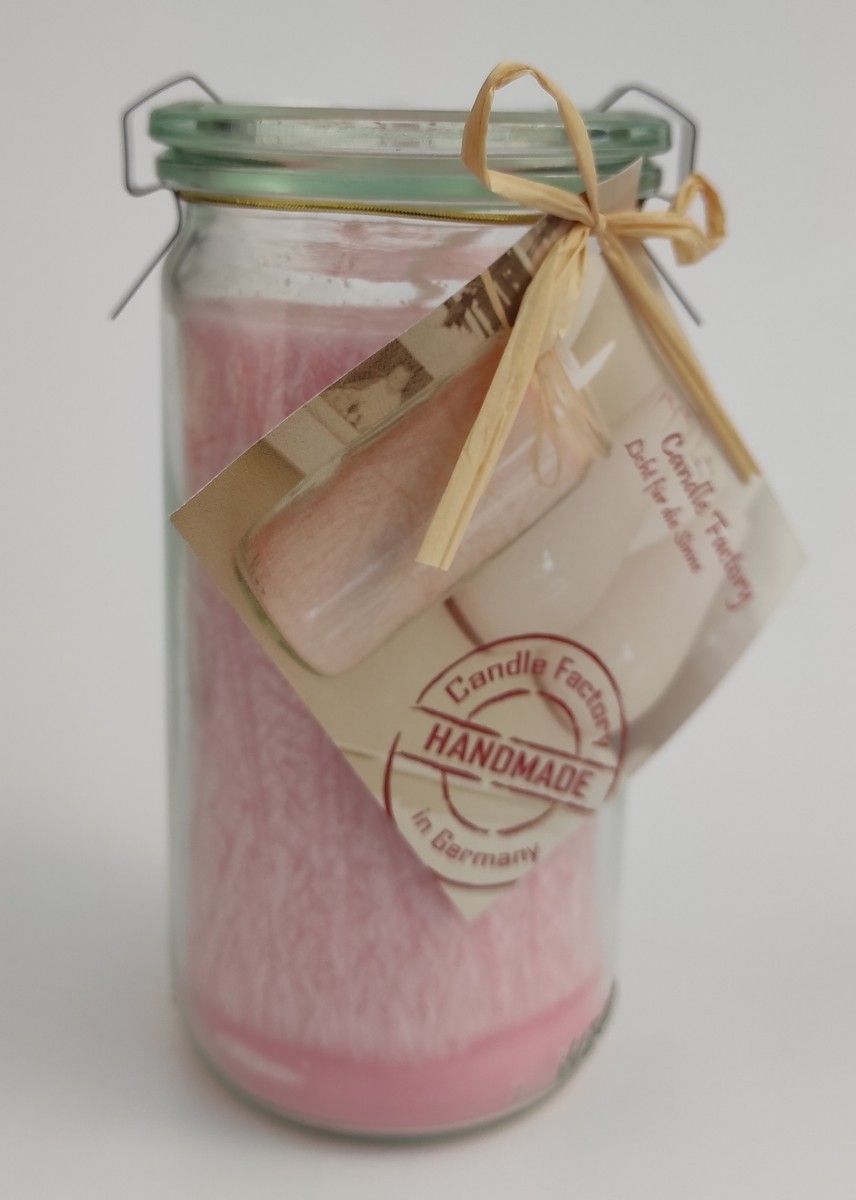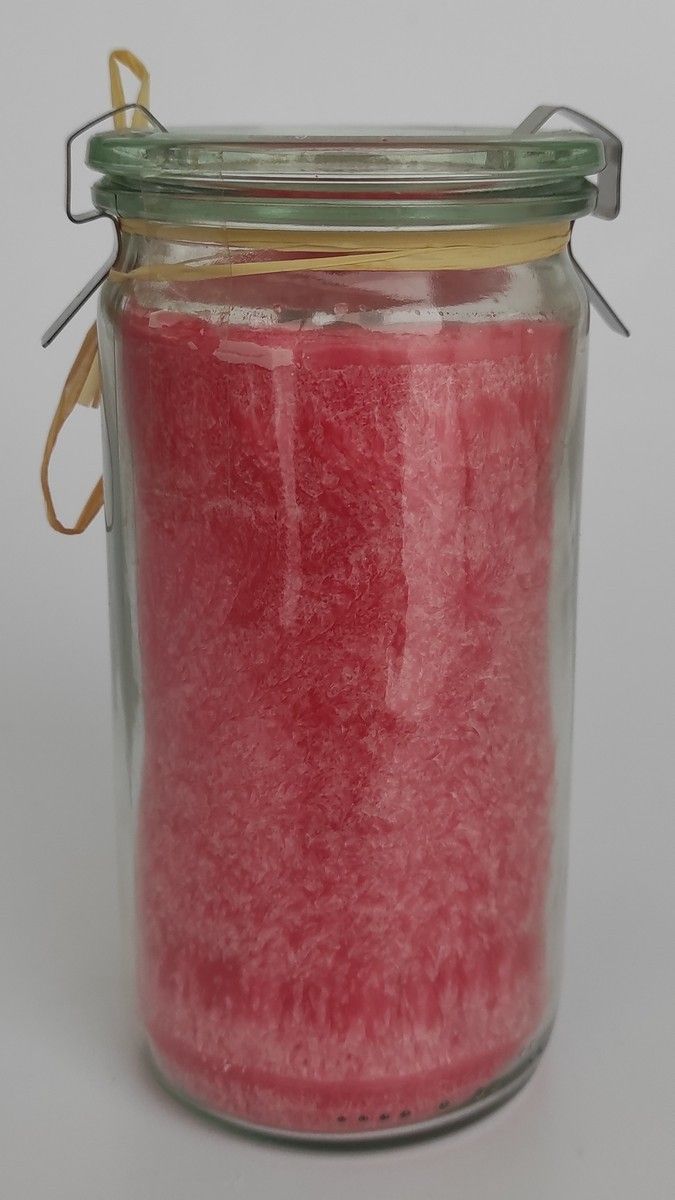 100% naturreines Stearin (Nachhaltiges Palmöl zertifiziert), durchgefärbt im Original Weckglas Zylinderform, inkl. Glasdeckel und zwei Klammern,