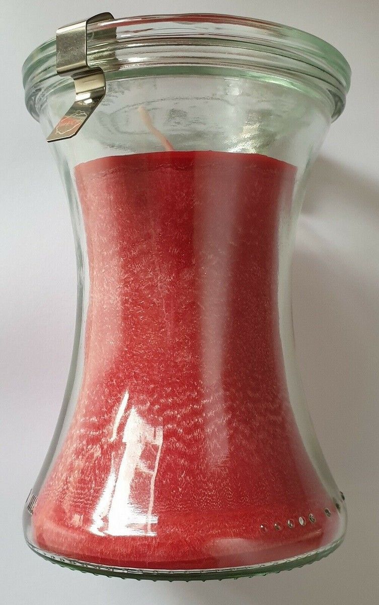 100% naturreines Stearin (Nachhaltiges Palmöl zertifiziert), durchgefärbt im Original geschwungenen Weckglas, inkl. Glasdeckel und zwei Klammern,
